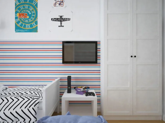 - Детская. Полоска должна вдохновлять! Сделайте одну стену с ярким рисунком или геометрическим орнаментом. Это создаст динамику и настроение для игр.