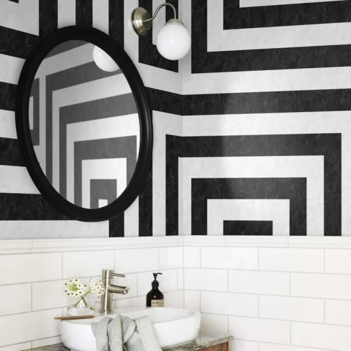 Это уже не просто рисунок, а полноценная фактура. Объёмные, выступающие полосы добавляют стенам невероятную глубину и динамику. Но будьте осторожны: слишком активный рельеф может утомлять. Разбавьте его спокойными однотонными участками. Зато с их помощью можно создавать бесшовные покрытия с фантастическим 3D-эффектом.