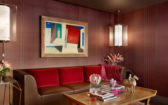 - Бордовые полоски — величие и дерзость. Смелое решение для акцентной стены в гостиной.