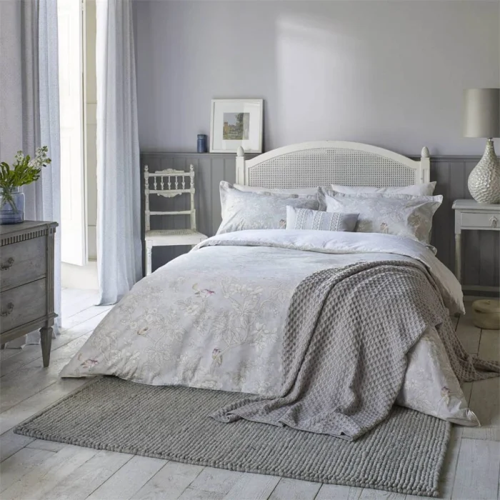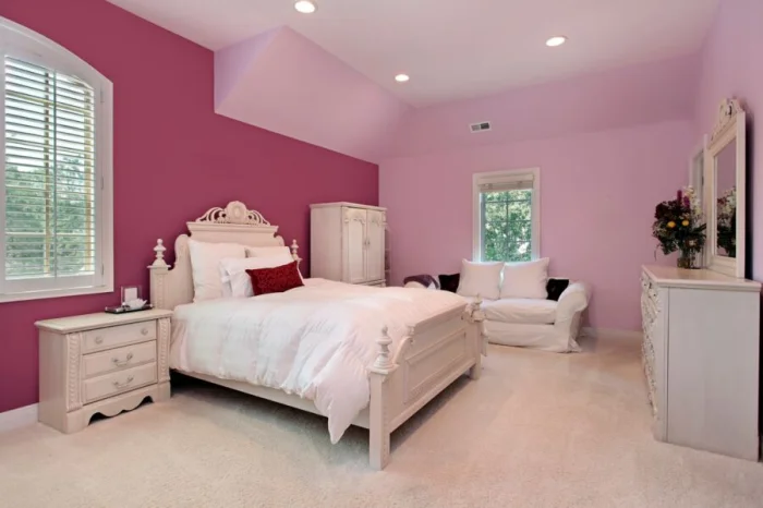 Для женской спальни часто выбирают розовые и сиреневые тона. Но не кричащие, а приглушённые: оттенок чайной розы, пыльная сирень. Они создают ощущение спокойствия и нежности. Бледно-сиреневый, кстати, отлично подойдёт и для кабинета.
