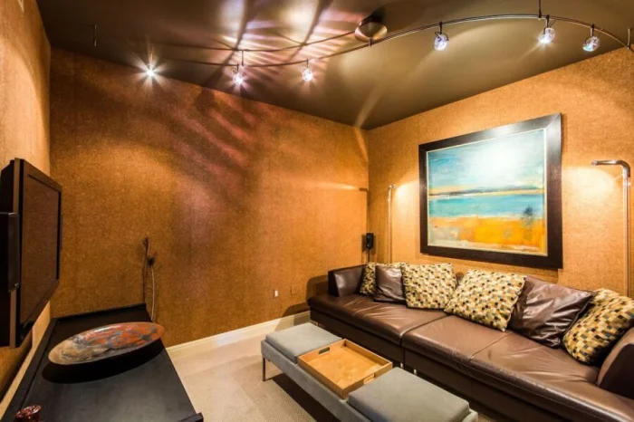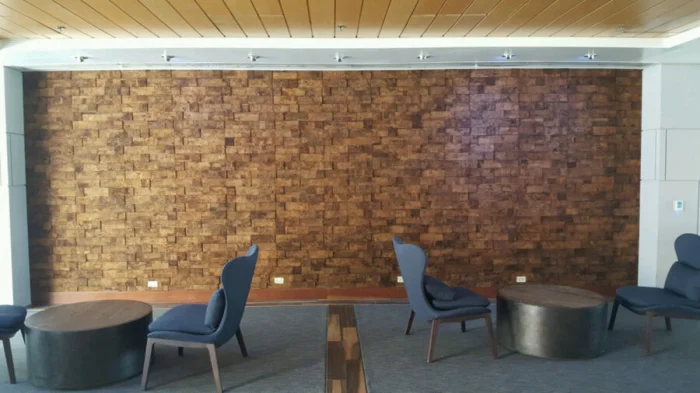 - Панели. Одно- или двухслойные плиты из спрессованного крупного гранулята. Толщина — 2 или 4 мм. Лицевую сторону покрывают лаком или воском. Чаще их используют для звукоизоляции, а декоративная функция — приятный бонус.