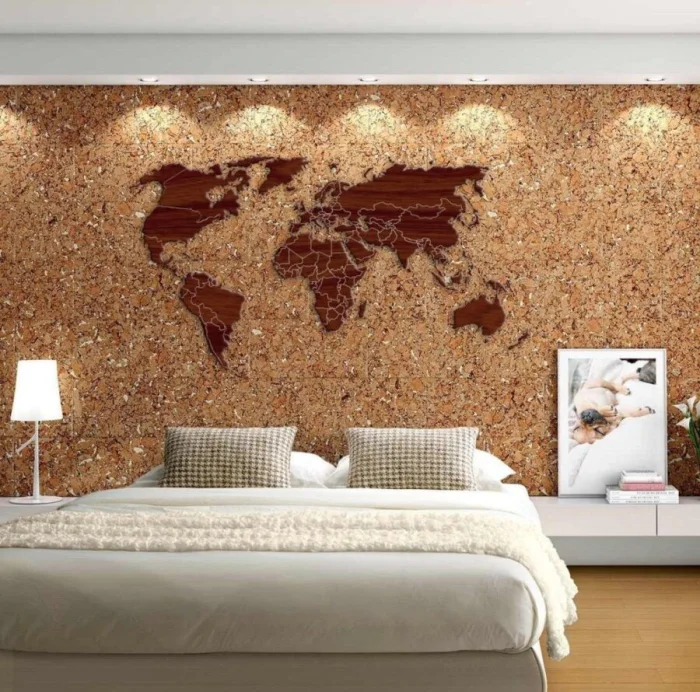 Благодаря лёгкости обработки из пробки вырезают узоры и панно, превращая стену в арт-объект. Это сразу выводит интерьер на другой уровень.