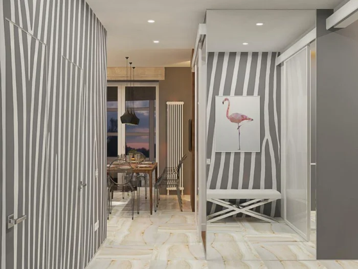 Тёмная, узкая прихожая — частая беда. Задача — «раздвинуть» стены. И тут на помощь снова приходит серый, но только светлый. Жемчужный, серебристый, серо-бежевый. Они отражают свет, делают пространство воздушнее. Рисунок? Только мелкий и ненавязчивый. Тёмно-серый оставьте для небольших акцентных вставок — например, у вешалки.