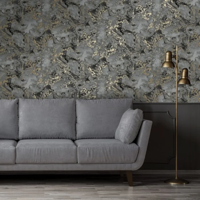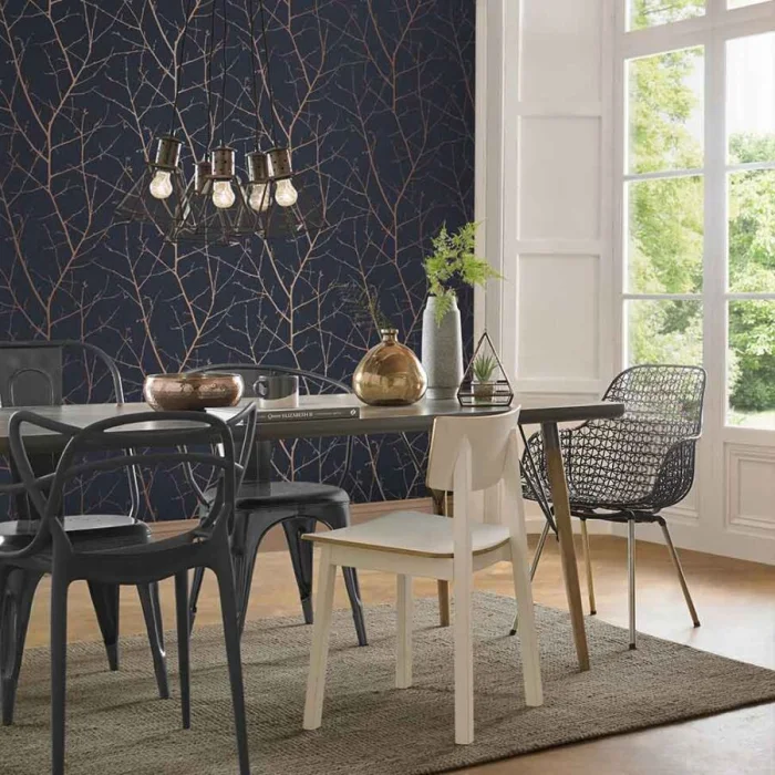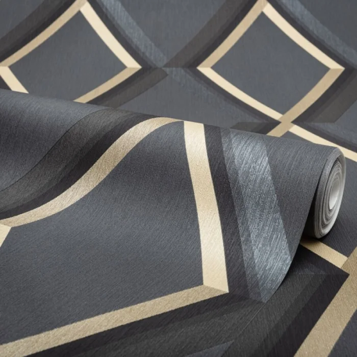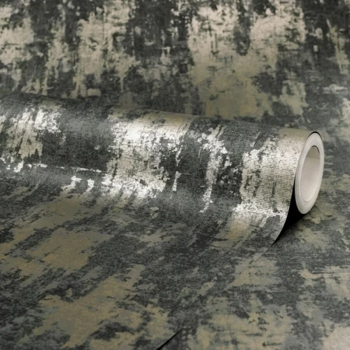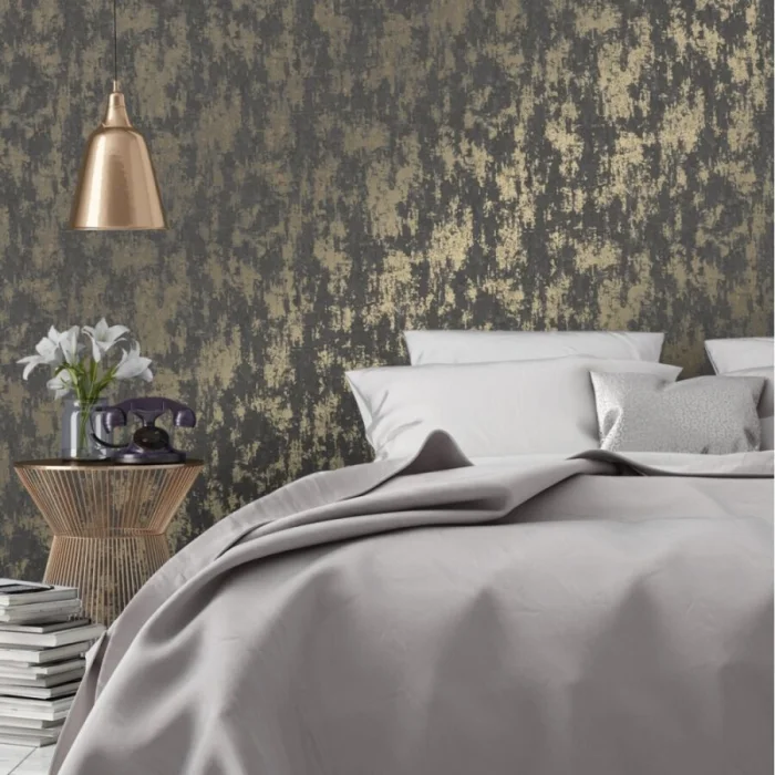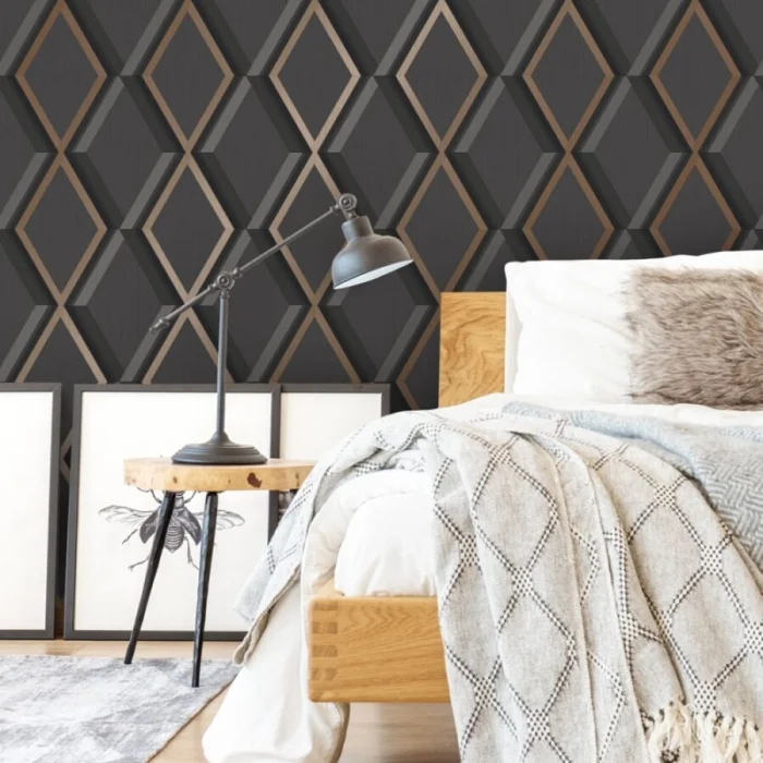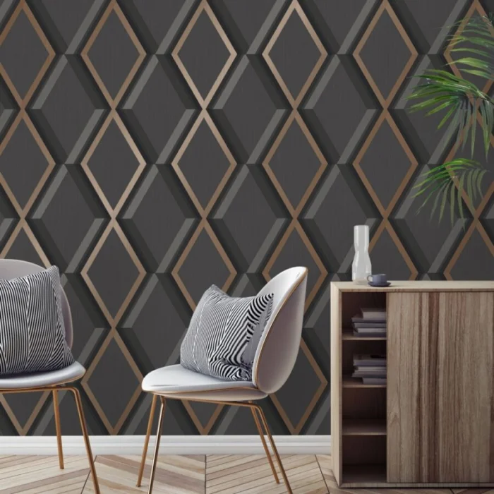 Темные обои с металлизированными вставками или блестящим принтом — тренд для смелых интерьеров в стиле лофт или хай-тек.
