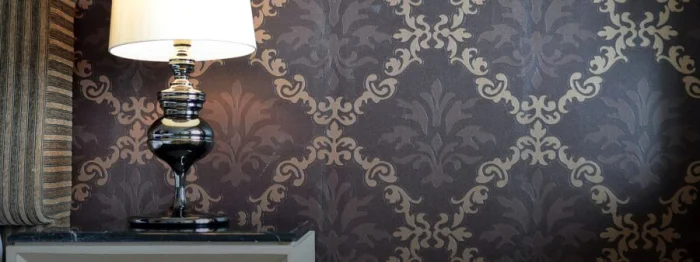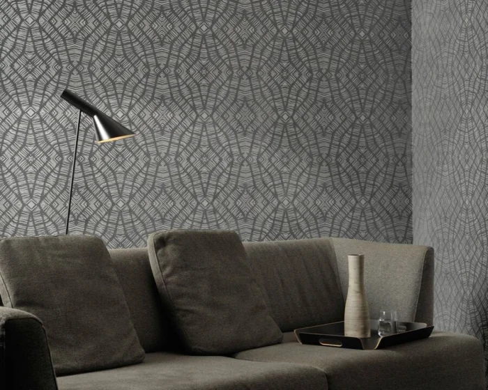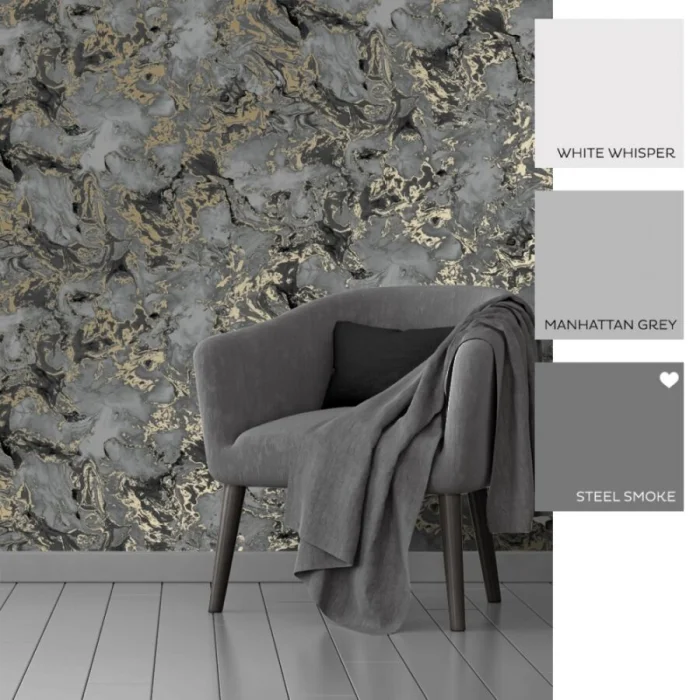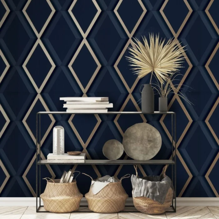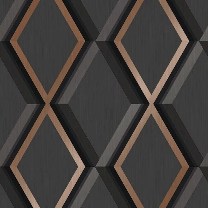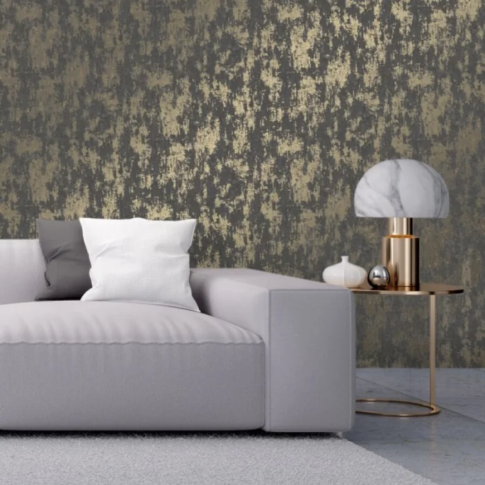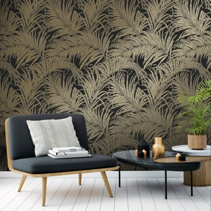Темные обои с металлизированными вставками или блестящим принтом — тренд для смелых интерьеров в стиле лофт или хай-тек.