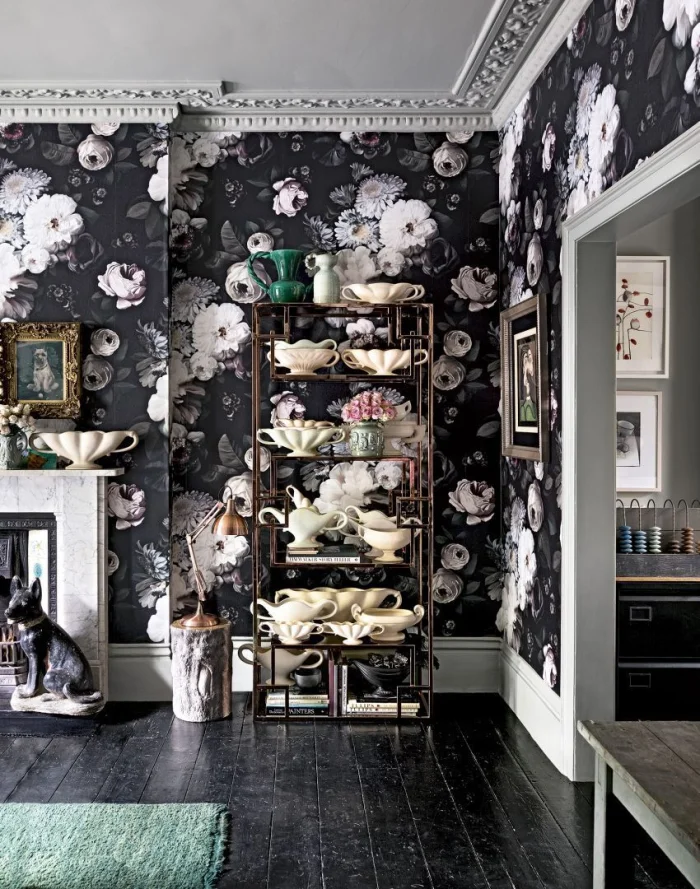 И не забывайте про принт! Узорчатые темные обои могут стать самостоятельным артефактом, вокруг которого строится весь интерьер.