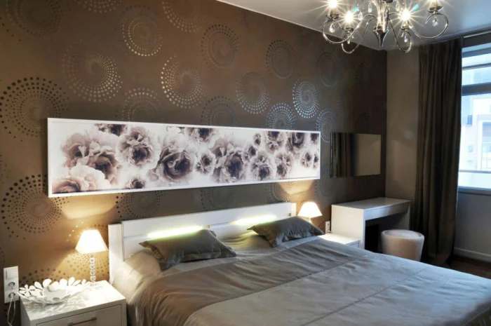 Коричневый в спальне — это не только стильно, но и физиологично. Этот цвет успокаивает нервную систему, снимает раздражительность и настраивает на сон. Чтобы комната не казалась слишком тяжелой, можно выбрать бежевые обои с коричневым рисунком.