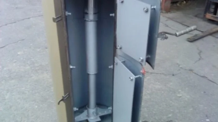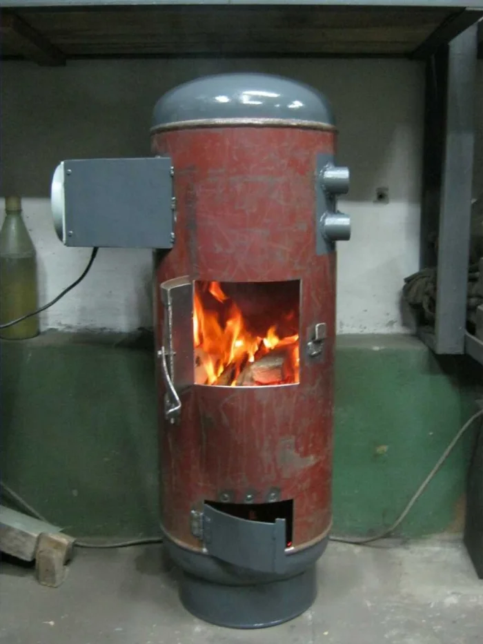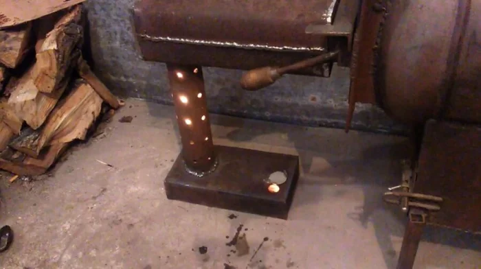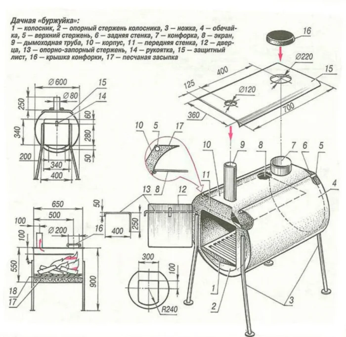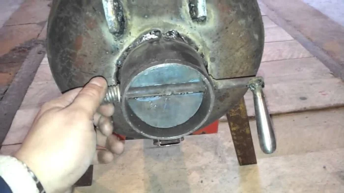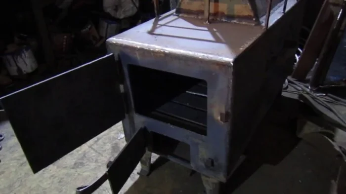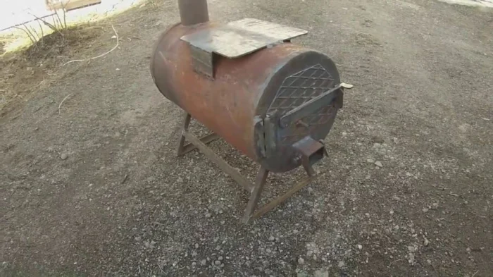 Ваша задача — грамотно врезать дверцы для закладки топлива и чистки, а также организовать отвод дыма. Внутри также нужно закрепить колосниковую решётку, подставив под неё опоры из уголка или арматуры. Главный плюс — минимальное количество сварочных работ.