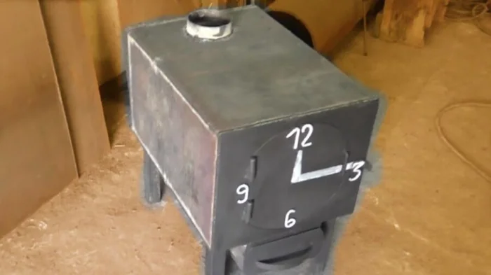 Финишные штрихи: приварите ножки и патрубок для дымохода в верхней части задней стенки или верха. Все острые кромки и заусенцы зачистите болгаркой. Печь почти готова.