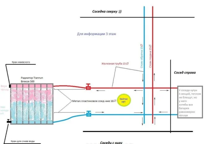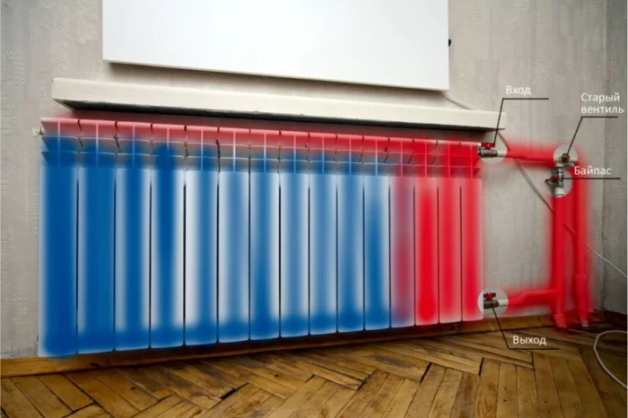 Здесь возможны несколько ошибок. Например, батарея висит с обратным уклоном. Или подключена не той стороной. Но самая частая и критичная ошибка — это отсутствие или неправильная установка байпаса.