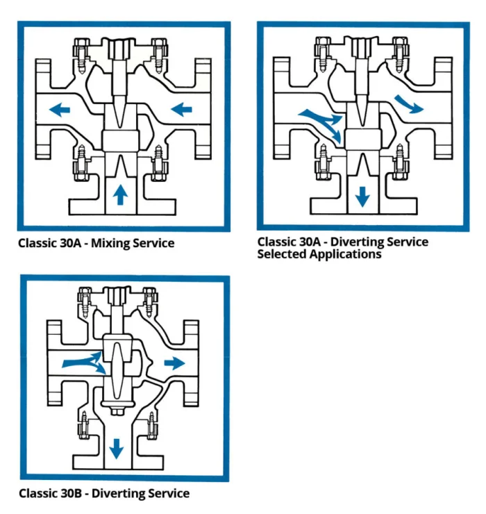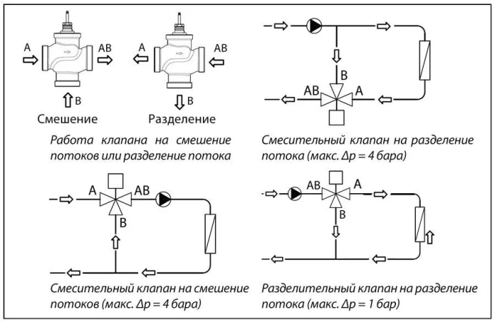 Все бытовые клапаны — смесительные. Разделительные (которые один поток делят на два) в домах практически не встречаются. А вот по типу управления выбор есть.