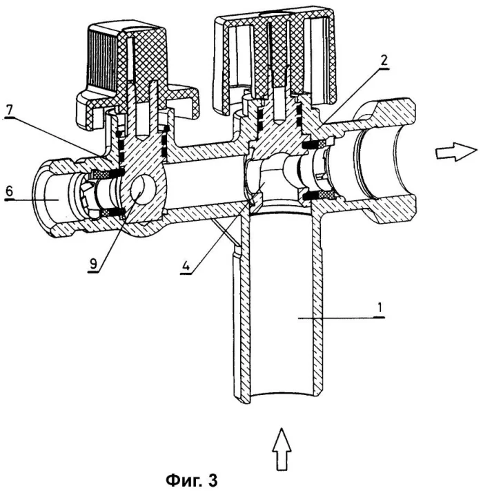 - Вкрутите клапан в верхний вход радиатора (по направлению потока, указанному стрелкой на корпусе). Термоголовка должна располагаться горизонтально.