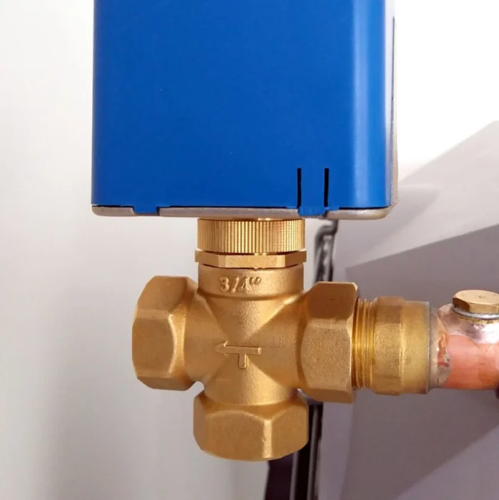 - Защита тёплого пола. Из котла идёт вода температурой 70-90°C, а в петли пола нужно не более 40-45°C. Клапан подмешивает в горячий поток остывшую воду из обратки, обеспечивая безопасный и комфортный нагрев.