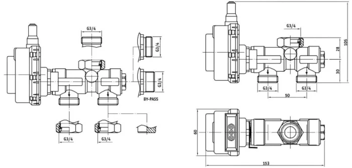 - Второй вход клапана (для обратки) соедините с байпасом.
