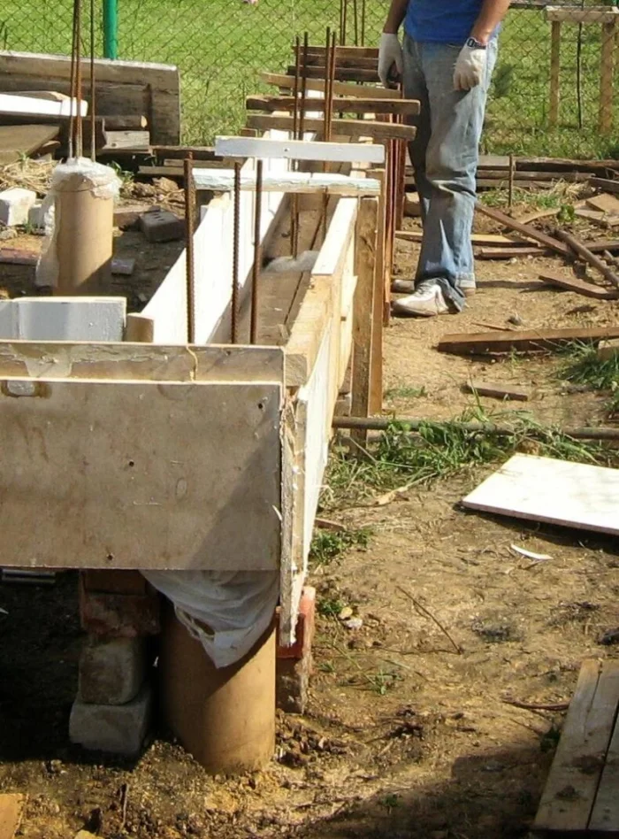 Щиты опалубки выставляем строго по разметке внутри траншеи. Снаружи укрепляем распорками из кольев и брусков, а сверху стягиваем проволокой или соединяем планками, чтобы бетон не раздвинул стенки. Не поленитесь проверить каждый щит уровнем! И помните, опалубка должна быть выше планируемой высоты фундамента.