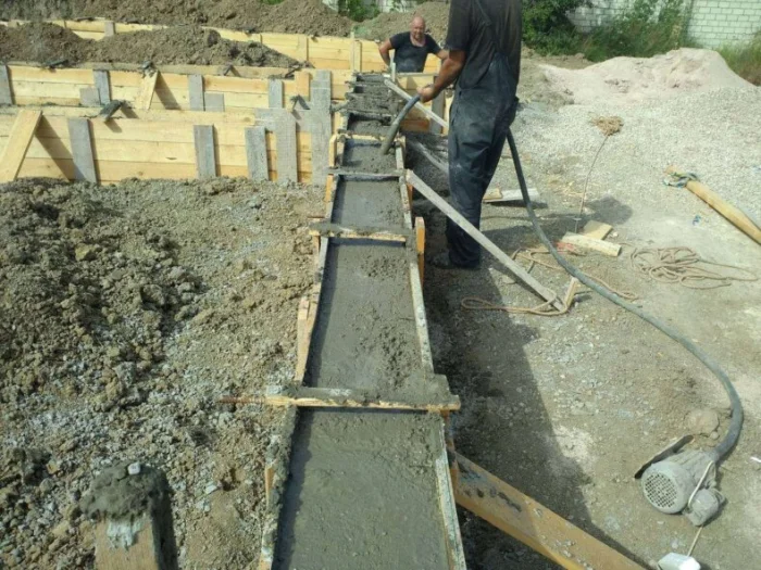 - Подаем бетон. Лучше с нескольких точек, чтобы не таскать его далеко по опалубке.