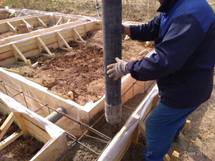 - Сразу же (!) включаем глубинный вибратор. Проходим каждый слой, чтобы удалить воздух. Без этого шага все предыдущие усилия теряют смысл.