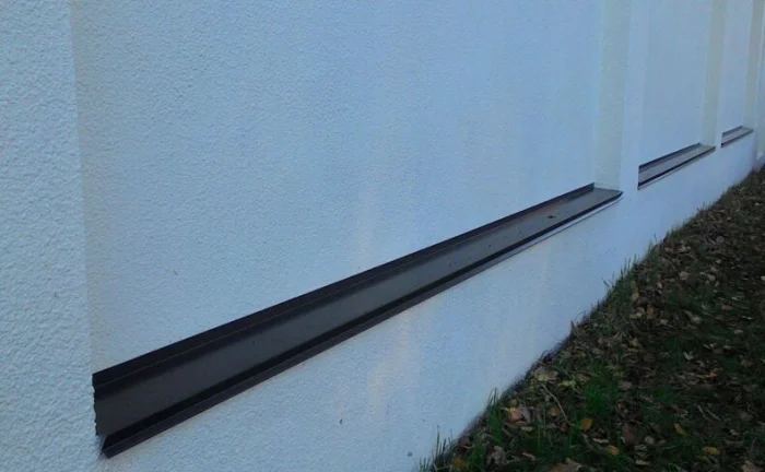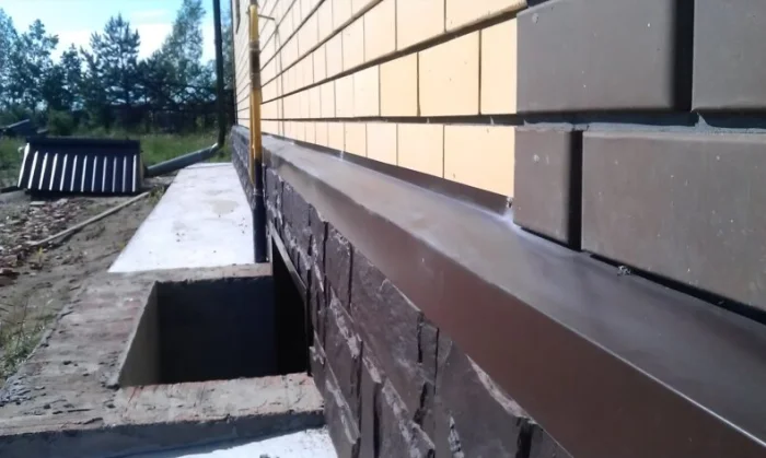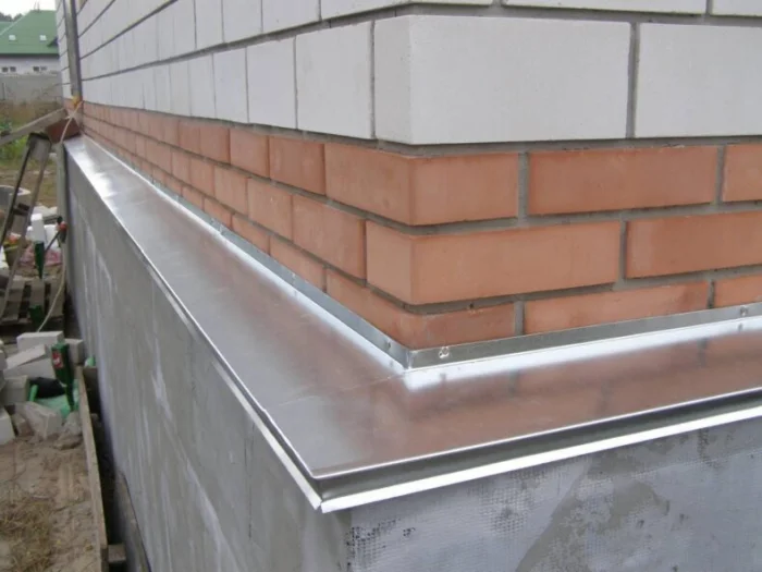 Самый распространенный случай. Отлив крепится к стене прямо над цоколем. Важно, чтобы нижняя его полка плотно прилегала к поверхности цоколя, а верхняя была надежно зафиксирована и загерметизирована на стене. Зазор — враг.