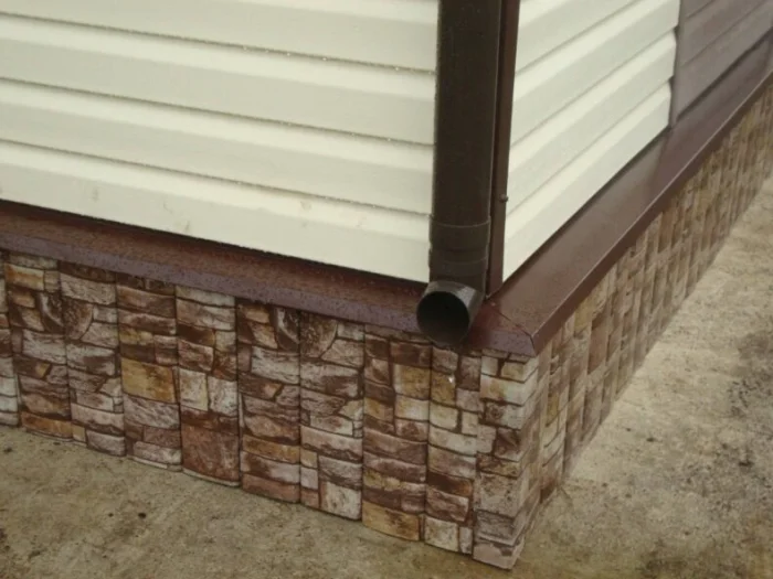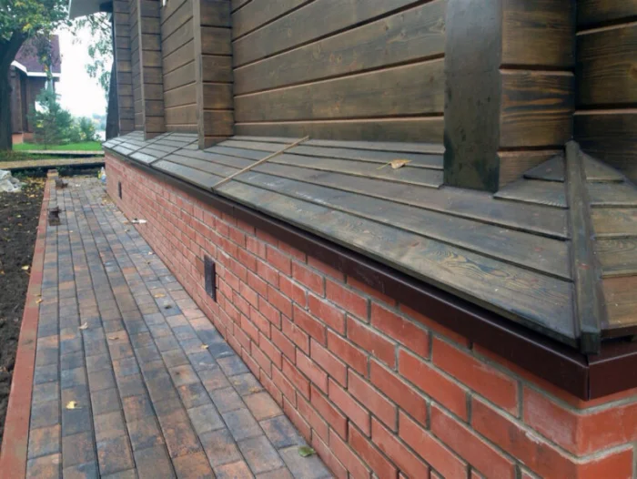 Тут цоколя как такового нет, есть забирка (фальш-цоколь) из кирпича, сайдинга или цокольных панелей. Отлив крепится к этой забирке. Крайне важно, чтобы сама забирка была надежно защищена от брызг снизу, иначе смысл отлива теряется.