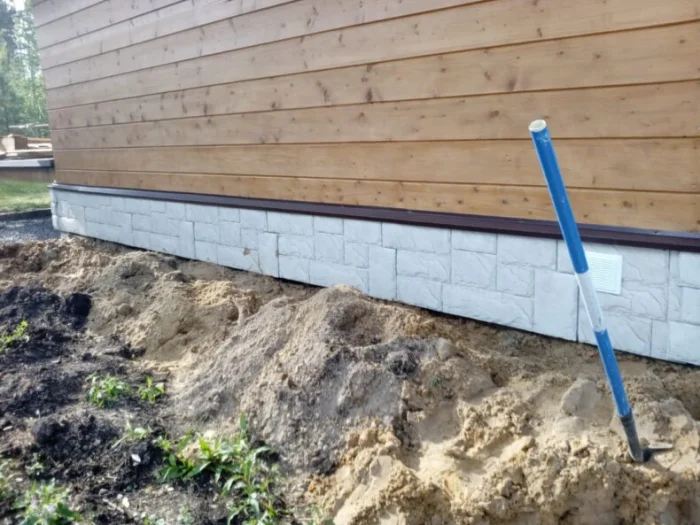 | 3 | Организуйте отвод воды. Часто под таким фундаментом есть продухи. Следите, чтобы отлив не перекрывал их, а вода с него не лилась прямо в продух. | Спланируйте уклон так, чтобы вода стекала в сторону от продухов, лучше — в дренажную канавку. |