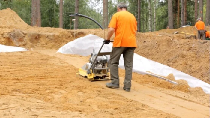 Трамбовка — это монотонная, пыльная и утомительная работа. Но это сердце процесса создания подушки. Можно нанять работников с техникой, но обязательно контролируйте результат. Слабо утрамбованная подушка — это гарантированная просадка и ремонт в будущем.