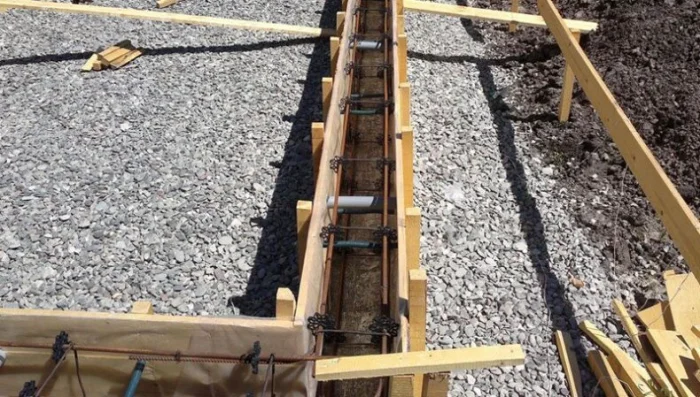 Перед заливкой основного бетона нужно проложить гильзы для ввода воды, канализации, электричества. Это делается согласно проекту.