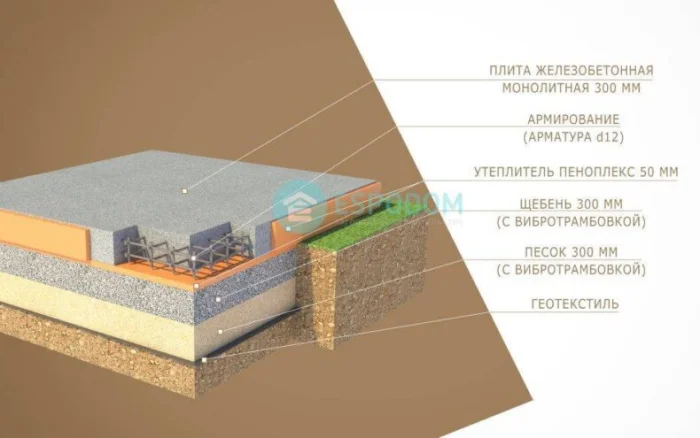 - Плитный фундамент (УШП, шведская плита). Здесь подушка — царь и бог. Это многослойная система: утрамбованный грунт, геотекстиль, щебень, песок, утеплитель, коммуникации. По сути, весь «пирог» под бетонной плитой и есть усиленная, умная подушка. Стоимость и сложность ее устройства — самые высокие.