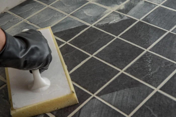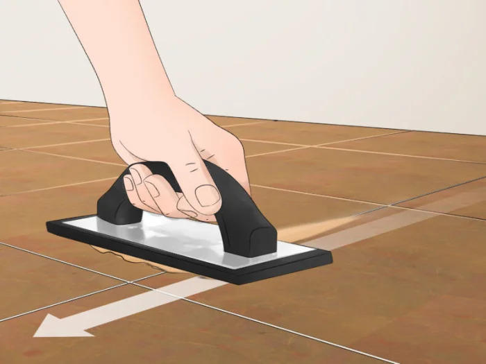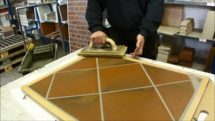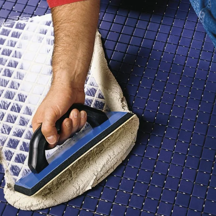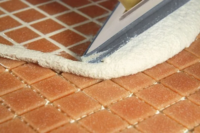 - Резиновым шпателем втираем смесь в швы, хорошо заполняя. Начните с наименее заметного угла, чтобы набить руку.