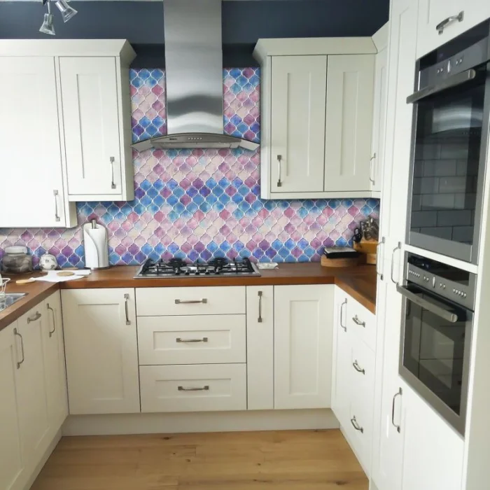 Помните про растяжку? Ее вытянутая форма родом из ванной комнаты. На фартуке ее обычно кладут горизонтально, и градиент бежит слева направо, создавая непривычный, но очень стильный динамичный эффект.