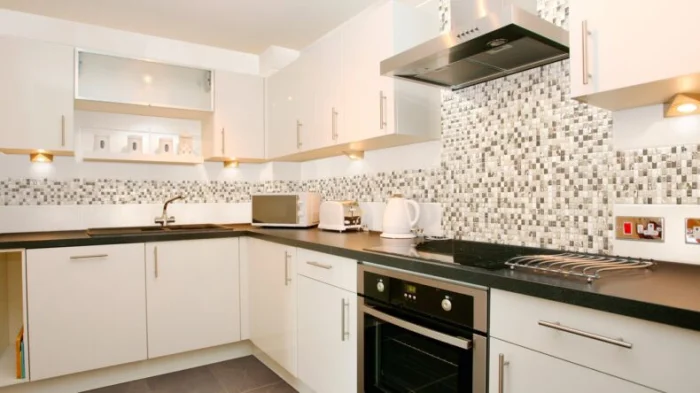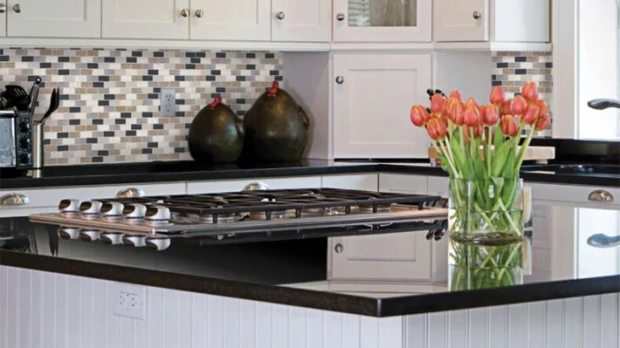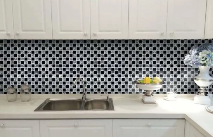 Идея для контраста: на светлой кухне с белыми фасадами черный мозаичный фартук станет драматичным и стильным акцентом. Он идеально поддержит черную варочную панель или вытяжку, создав завершенную композицию.