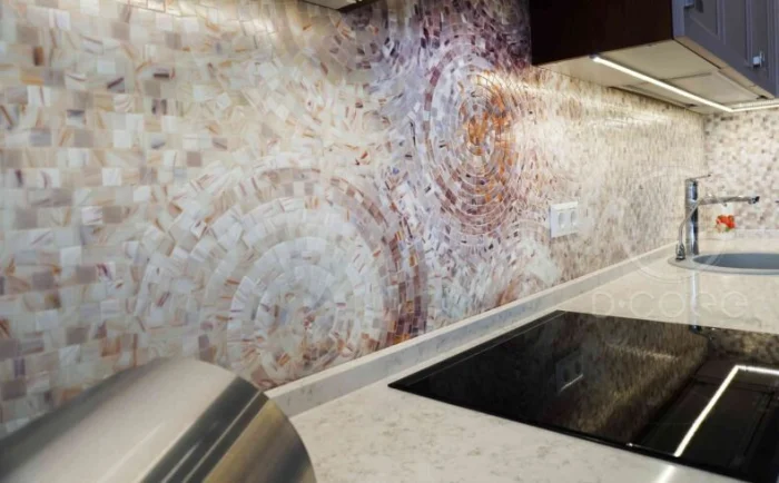 Вот в чем главное волшебство мелкой мозаики: она способна обнять любую криволинейную поверхность, скрыть мелкие огрехи и превратить стандартный фартук в арт-объект.