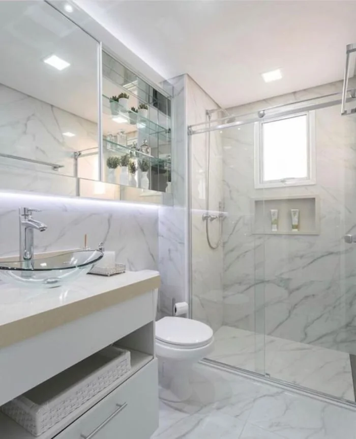 Любой оттенок мраморной плитки хорош, но пальму первенства прочно удерживают белый и светло-серый с деликатными прожилками. Выглядит свежо, чисто и визуально расширяет пространство.