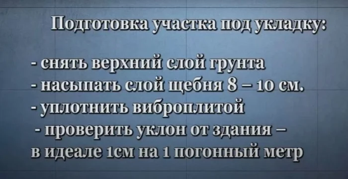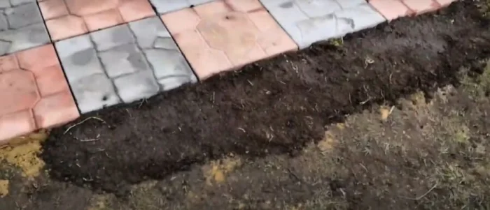 Нужно вынуть грунт на глубину всего «пирога». Для пешеходной дорожки это примерно 25-30 см. Дно траншеи должно быть ровным и иметь небольшой уклон (примерно 1 см на метр) для стока воды. Тщательно утрамбуйте земляное дно. Это важно!
