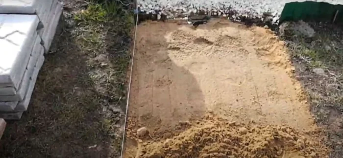 - Песок. Желательно речной или мытый, без глины. Он нужен и для подушки, и для засыпки швов.
