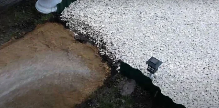 Первым делом застелите дно траншеи геотекстилем с запасом на борта. Затем засыпьте слой щебня толщиной 10-15 см, разровняйте и утрамбуйте. Щебень — это фундамент, который не даст дорожке просесть. Поверх щебня снова постелите геотекстиль. Он не даст песку следующего слоя забить пустоты между щебнем.