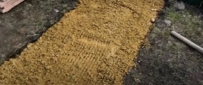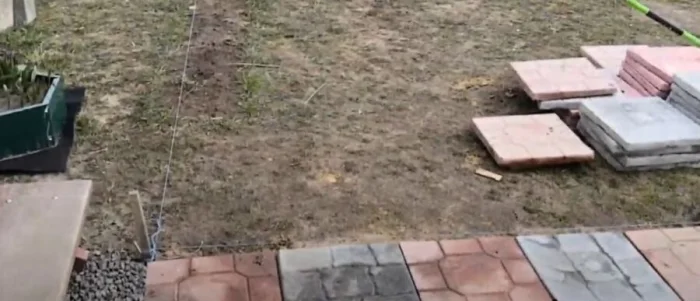 Не пренебрегайте этим этапом! Вбейте колышки по углам будущей дорожки и натяните между ними шнур. Сразу закладывайте ширину с учётом бордюров (добавьте по 10 см с каждой стороны). Проверьте углы и параллельность линий. Хорошая разметка — залог ровной дорожки.
