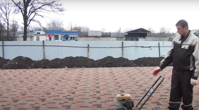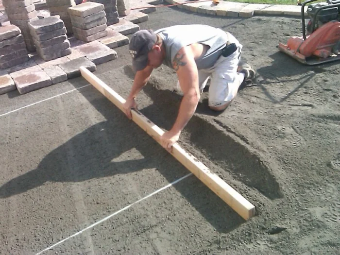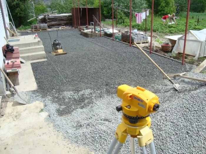 Насыпьте слой песка (5-7 см) или сухой цементно-песчаной смеси (гарцовки). Разровняйте правилом или длинной ровной доской, чтобы получить идеально ровную плоскость с нужным уклоном. Затем обильно пролейте водой из шланга с распылителем и снова утрамбуйте. Это основа для плитки, и она должна быть жёсткой.