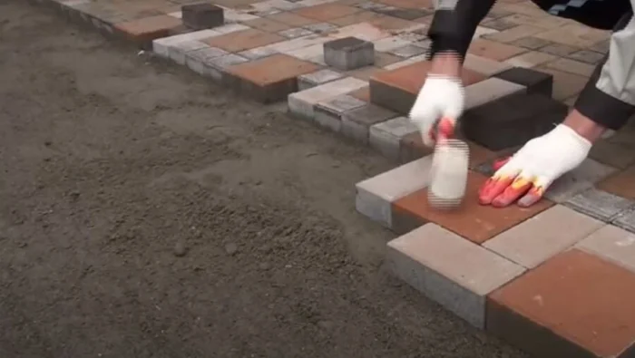 Когда вся плитка уложена, самое время зафиксировать её. Рассыпьте по поверхности сухой просеянный песок (или ту же гарцовку) и прометите его жёсткой щёткой во все швы. Делайте это тщательно, пока все пустоты не заполнятся. Затем аккуратно пролейте дорожку водой. Песок в швах уплотнится, при необходимости досыпьте ещё. Этот слой скрепит всё покрытие в монолит.