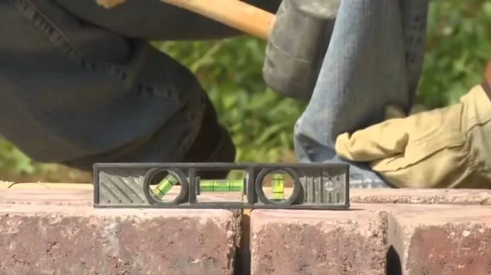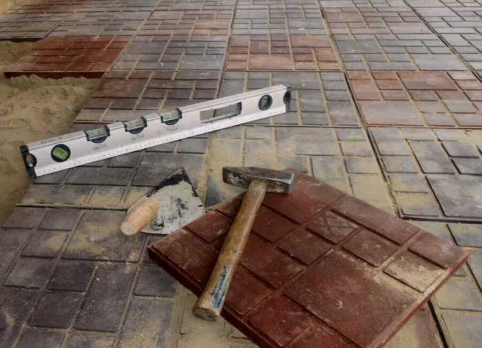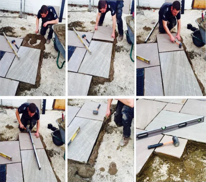 Начинайте укладывать от себя, продвигаясь по уже уложенным плиткам, чтобы не деформировать подготовленное основание. Кладите каждую плитку на место, слегка пристукивая резиновым молотком. Контролируйте уровень и уклон. Между плитками оставляйте зазор 2-3 мм — для этого удобно использовать пластиковые крестики. Не бойтесь резать плитку болгаркой с алмазным диском для подгонки у краёв.