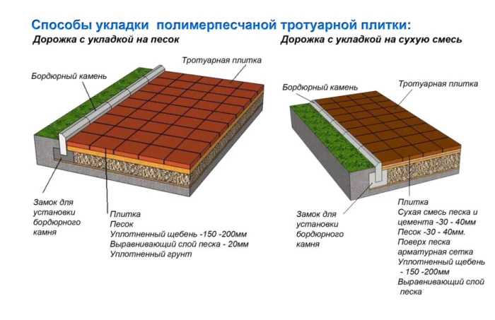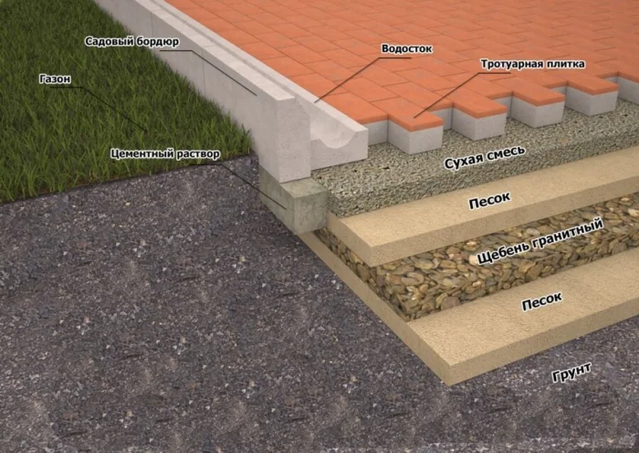 - Песчаное. Самый простой и дышащий вариант. На утрамбованный песок укладывается плитка. Отлично подходит для сухих, стабильных грунтов и пешеходных дорожек. Главный плюс — великолепный дренаж.
