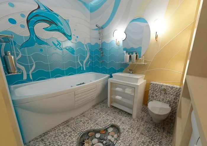 Хотите по-настоящему уникальный дизайн? Возьмите в руки кисть (или баллончик). Геометрические узоры, абстракция, морская тема — подойдёт всё, что соответствует стилю вашей ванной.