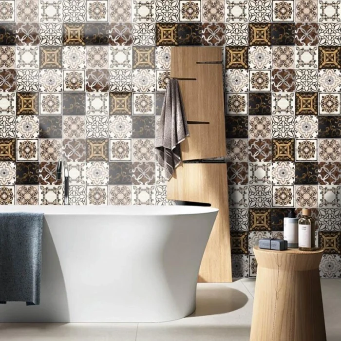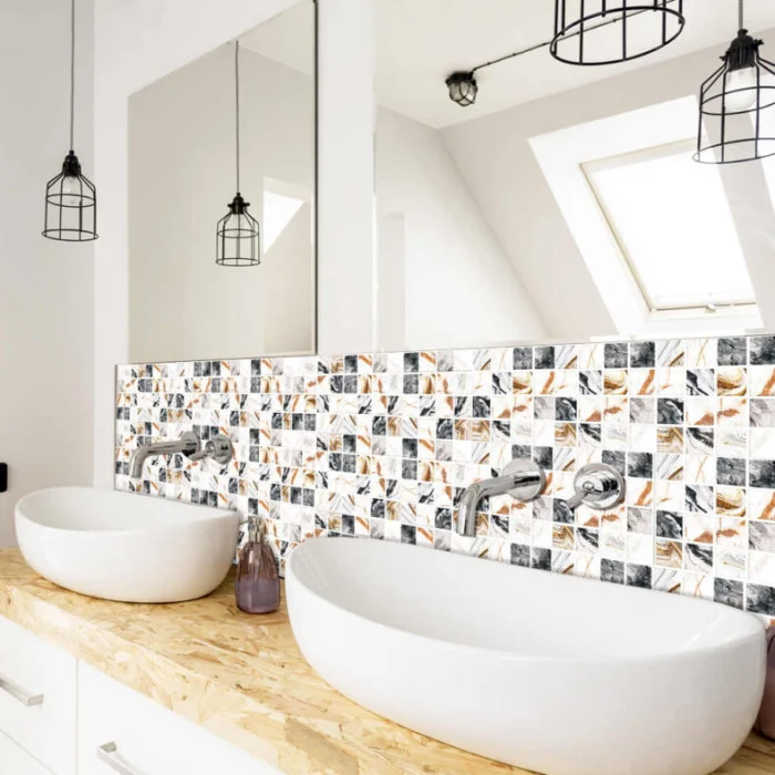 Самый быстрый способ изменить настроение ванной. Выбираете понравившийся узор — и через полчаса у вас новая стена. Стикеры отлично маскируют мелкие сколы и трещины.