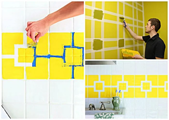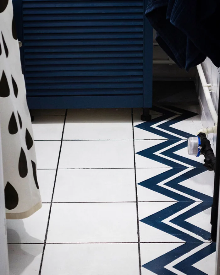 Малярный скотч — лучший друг для создания геометричных узоров на плитке. Заклеили, покрасили, дождались высыхания, отклеили.