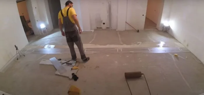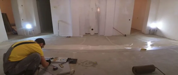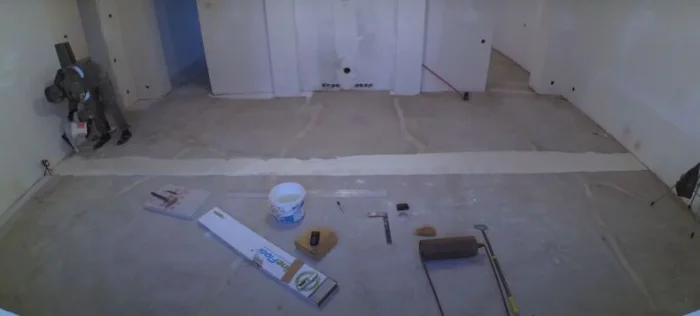 Если у вас тёплый пол, отключите систему за сутки до начала работ. В комнате должно быть чисто, сухо, проветрено. Оптимальная температура — от +18°С до +26°С, влажность — умеренная.