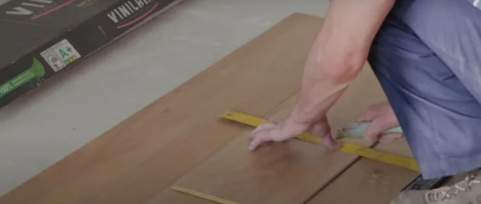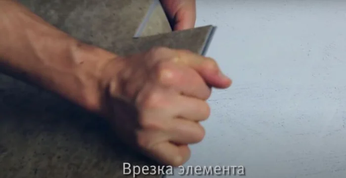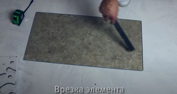Резать кварцвинил проще простого — острым ножом. Сделайте надрез по лицевой стороне, используя металлическую линейку как направляющую. Затем согните плитку — она аккуратно переломится по линии. Останется только дорезать нижний слой. Смотрите на стрелки на подложке — они указывают направление укладки.