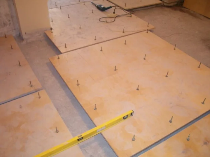 Если у вас старый деревянный пол, скрипящие и гнилые доски придётся демонтировать. Затем засыпать керамзит, сделать стяжку или настелить влагостойкую фанеру/ДСП, прикрутив саморезами. Поверхность затем обязательно загрунтовать.
