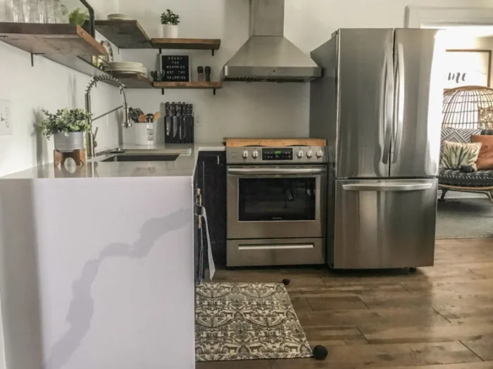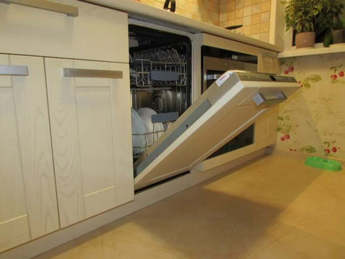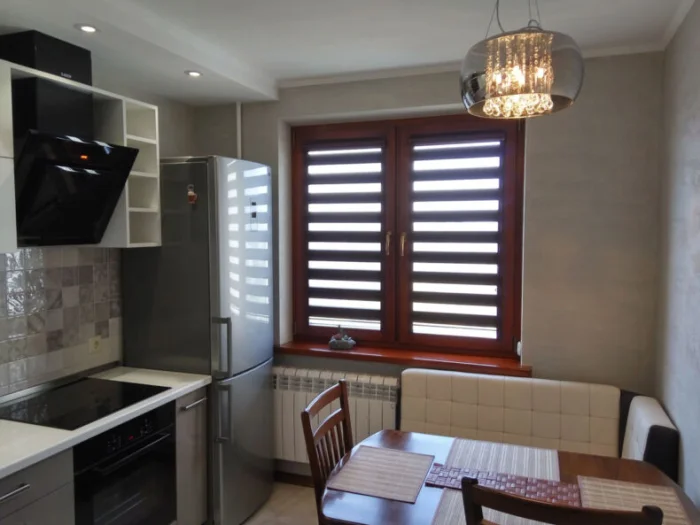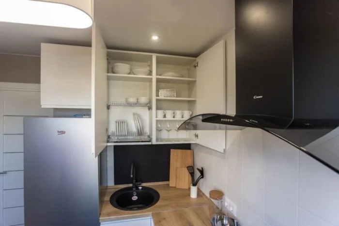 - Техника — компактная и встраиваемая. Холодильник можно выбрать узкий, но высокий.