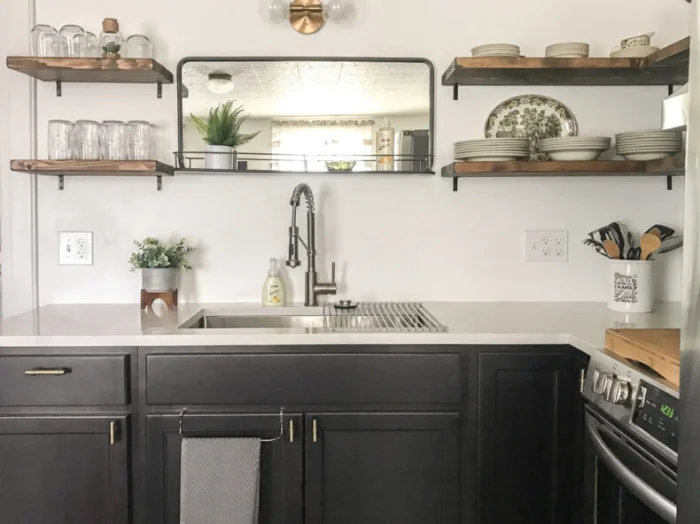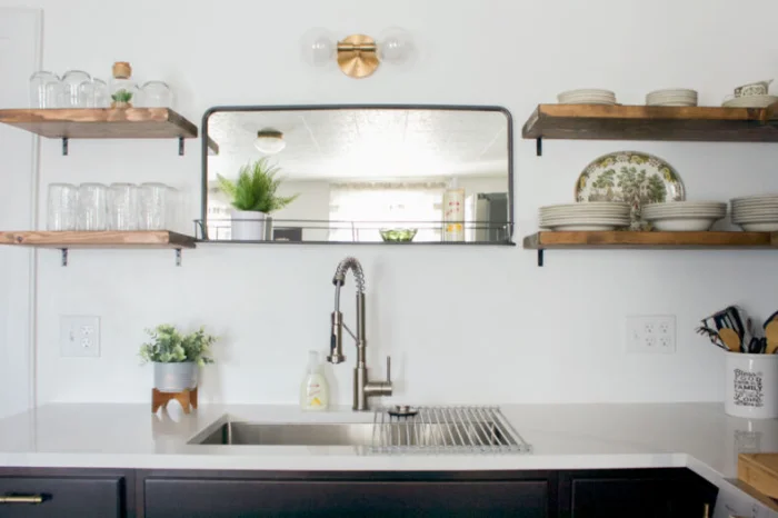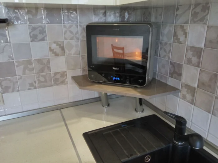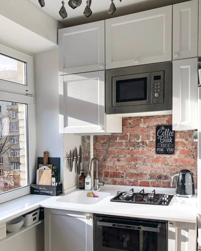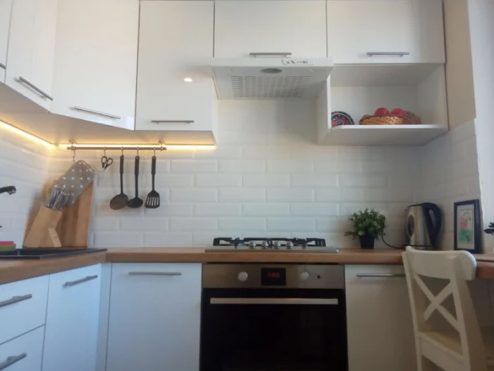- Свободная столешница. Всё, что можно повесить — вешаем. Всё, что можно убрать — убираем. Порядок визуально добавляет места.