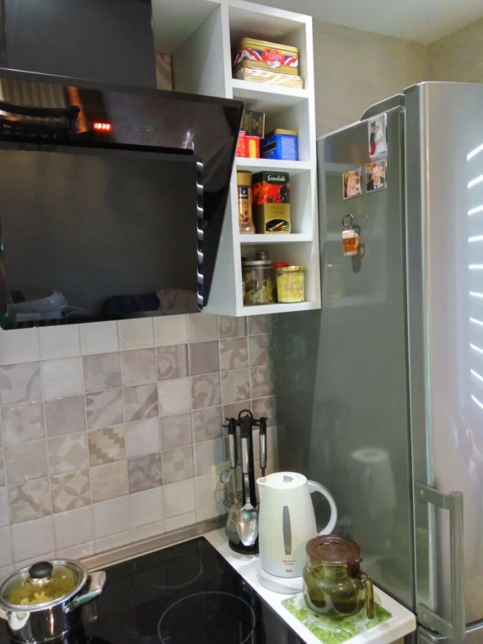 - Вытяжка. Встраиваемая модель с полками по бокам — функционально и экономно.