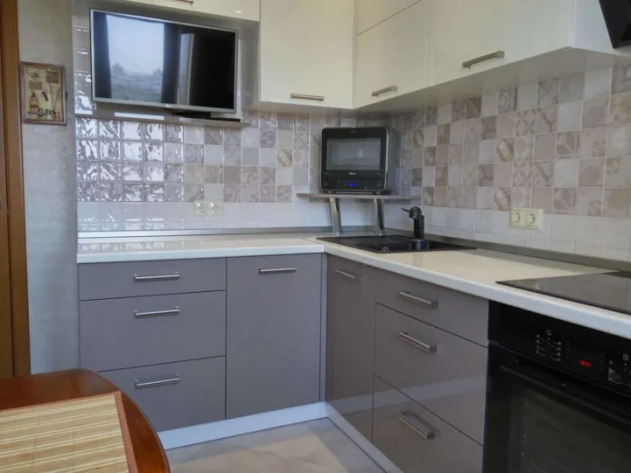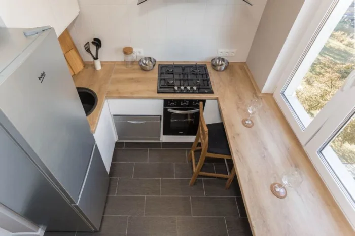 - Скруглите острый угол столешницы у входа — так будет безопаснее и визуально мягче.